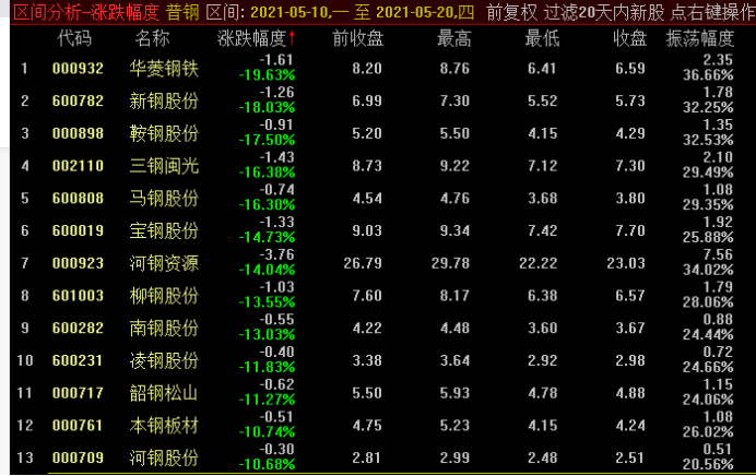 个股方面,华菱钢铁、新钢股份、鞍钢股份跌幅分居前三,分别下跌19.63%、18.03%、17.5%,此外还有10只个股跌幅超过10%。