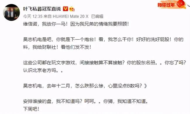 此外,叶飞还爆料了维信诺和昊志机电,并说放维信诺一马,“因为我兄弟的情绪我要照顾”,下一个开炮的就是昊志机电,“认识北京老方吗”、“去年十二月,怎么跌那么惨”。