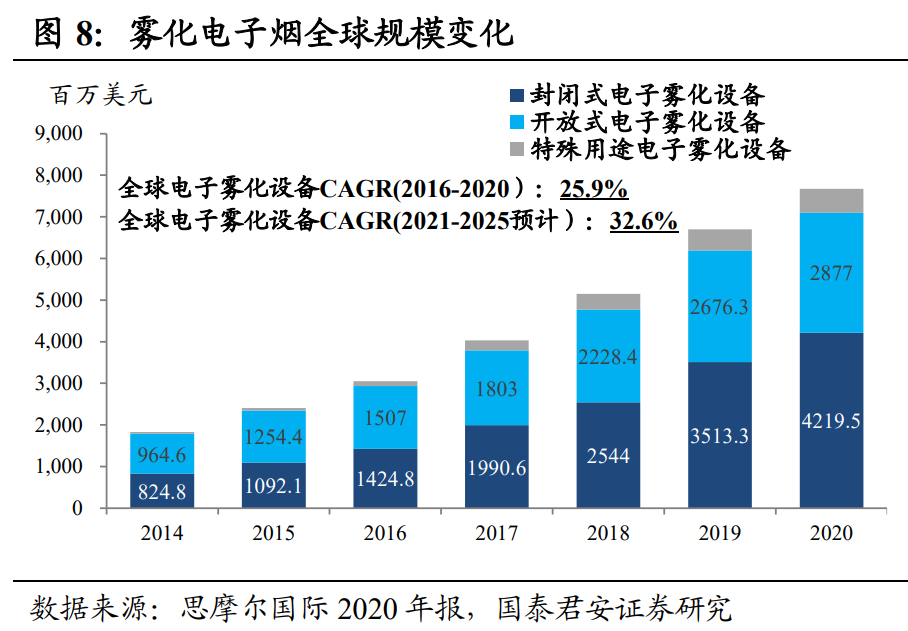 作为典型成瘾性赛道,电子烟市场的扩张有较大的确定性。中上游的制造企业除了关注政策走向之外,可以更多对标国际市场的增长。根据佛若斯特沙利文的预测,2023年,全球新兴烟草市场规模将高达1734亿美元。