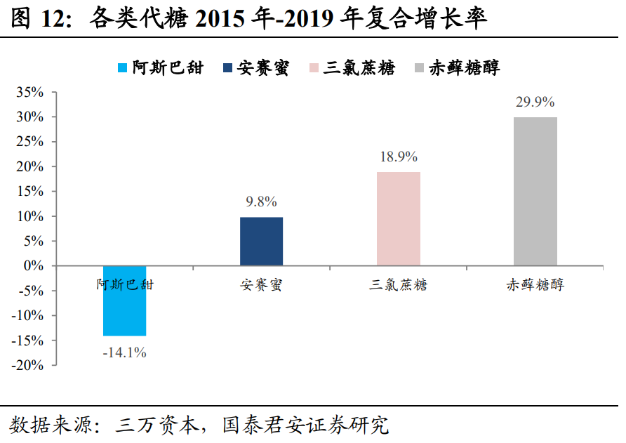 此前的主流甜味剂主要是阿斯巴甜、安赛蜜,阿斯巴甜由于可能的副作用被百事弃用,未来市场会进一步下降,赤藓糖醇的优势在于其零热量、零糖,但其甜度不及蔗糖,使用成本较高。