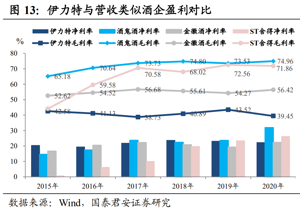 伊力特的主打产品“伊力老窖”是超10亿的大单品,而高端系列的伊力王也在不断优化渠道、提升品牌,2020年高端酒的下降幅度低于中低端。2021年一季度,公司疆内销售增速已经逐渐转正,随着疫情的恢复,公司业绩会有一定回归。