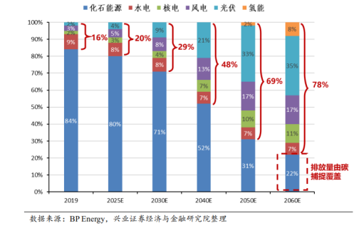 兴业证券表示,“碳中和”意味着我国能源体系必须向更清洁+更安全+更经济转型。能源需求的增长和碳排放下降的约束将使得我国完成碳中和目标更具挑战,需要强有力的政策支持指引,但同时也将加速中国的能源转型、使得我国经济最终受益。据相关预测,预计到2060年78%的一次消费能源将由清洁电力供应,剩余约22%的能源消费将通过碳捕捉方式,实现碳中和。而实现这一变化,需要能源供给端和需求端的共同努力。其中供给端将主要依靠电力的清洁化以及非电的清洁化,需求侧则需要推动电力、氢能等新用能形式的落地。