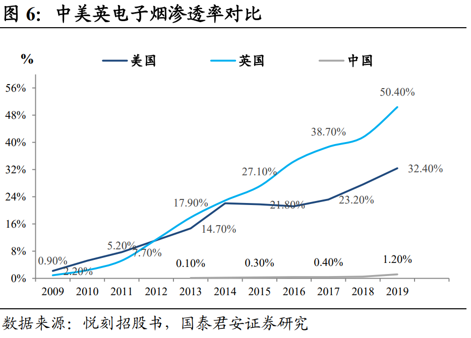 对于雾化产品和HNB,暂时很难确定我国市场未来二者比例。美国是以JUUL为代表的雾化产品为主,日本近乎全是HNB市场,贡献了全球近90%的份额,而英国也是倾向雾化市场。