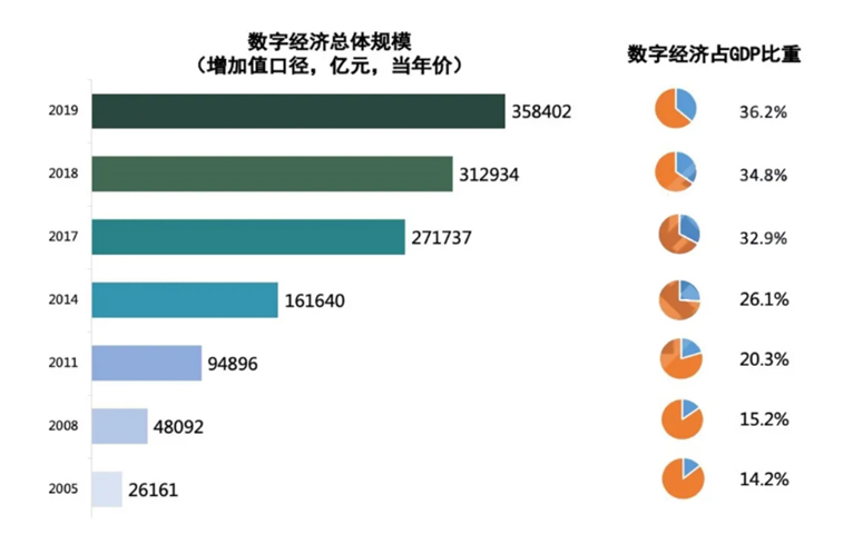 有数据统计,在过去30年里,数字技术投资每增加1美元,便可撬动GDP增加20美元;数字化技术的长期投资回报是非数字化技术的6.7倍,数字经济的增速是全球GDP增速的2.5倍。中国信通院的调查显示,2019年,我国数字经济增加值规模35.9万亿元,占GDP比重达到36.2%。