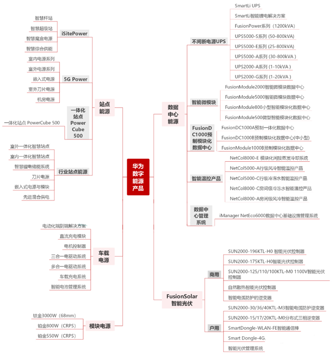 华为数字能源“全家桶”包括近60个系列产品,主要覆盖 站点能源 、 数据中心能 源 、智能光伏 、 车载电源 、 模块电源 五大业务。