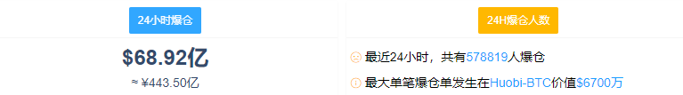 数据显示,在过去的24个小时内,有约57.8万人爆仓了68.92亿美金(约合人民币443亿元)。