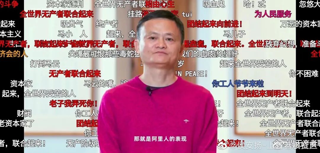 B站的用户,读毛选,把“吸血鬼”、“骗子”、“万恶的资本家”、“财阀”全扣在马云头上。