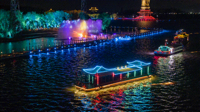 由溱湖文化旅游集团打造的首部行进式夜游灯光演艺秀《一梦到溱湖》极为惊艳。暮色降临,泰州姜堰溱湖新添璀璨风景,游客泛舟溱湖,赏夜景,感受历史文化。该项目依托古寿圣寺三面药师佛塔(城市地标)、溱湖旅游景区(国家5A级景区)、溱湖旅游度假区(省级旅游度假区)等优质旅游资源,植入神话传说IP,采用“光影+演艺+游船”的方式,将声、光、电、服、化、道、水、火、雾等特效与先进的科技手段有机融合。这种实景与虚拟情景重叠呈现的形式,让游客沉浸于夜色中,达到“梦里不知身是客”的效果,真正实现游客的“一梦到溱湖”。