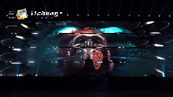 现场最高潮部分在长度为39米,高度11.5米的视频立方体两侧的魔方舞台整体向前失重倾斜70°形成矩阵屏组,最大限度的改变观赏空间,带来强烈的视觉感官体验,因此被称为“会跳舞的大屏幕”。