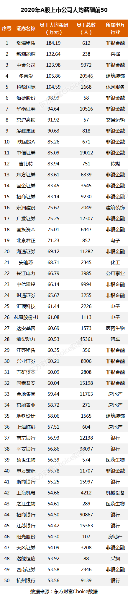 人均薪酬最高的上市公司为非银金融行业的渤海租赁,人均薪酬达184.19万元。此外,还有新潮能源、中金公司等4家公司人均薪酬超过100万元。