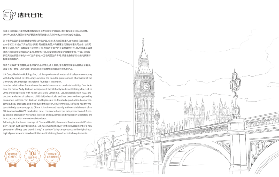 1967年在伦敦,英国剑桥大学教授兼药师安迪.杰克森,创立安迪贝比(英国)药业控股集团,旗下Canty为专业级母婴护理品牌,并于2002年同洁氏日化合作研发 适合亚洲人体质 的母婴护理产品。