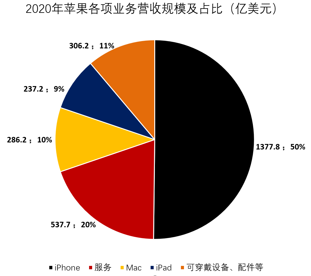 据财报数据显示,2020年,苹果来自服务业务的营收为537.68亿美元,同比增长超16%,创下有史以来的最好成绩,收入占比已接近20%,成为苹果的第二大业务。