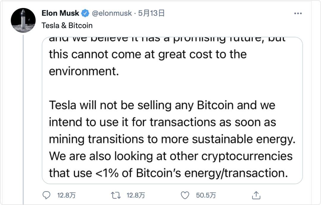 在被币圈人士视为“叛徒”之后,马斯克曾在社交媒体上辩解称,自己仍然看好加密货币,只不过比特币会导致增加消耗能源,会和狗狗币技术人员开发出更低耗高效的方式。