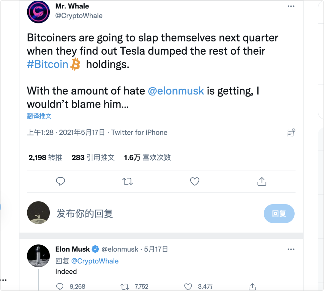 5月17日,一自称加密货币分析师的用户在推特上表示,当他们在下个季度发现特斯拉已出售剩余的比特币持仓时,比特币持有者可能会扇自己耳光。对此,马斯克回复,“确实”。