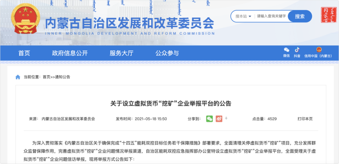 5月19日早间,内蒙古发改委也发布公告,设立虚拟货币“挖矿”企业举报平台,全面受理关于虚拟货币“挖矿”企业问题信访举报。