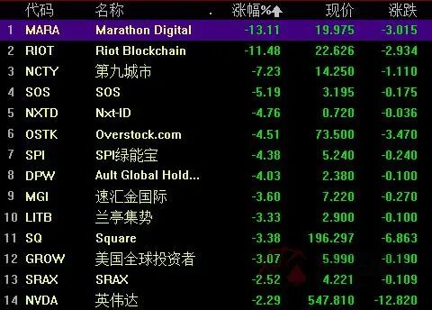值得一提的是,比特币大跌后,加密货币交易平台币安宣布暂停以太坊和ERC20的提款。全球最大加密货币交易平台之一Coinbase更是出现了宕机。受到消息影响,美股区块链板块集体大跌,Coinbase开盘下跌12%至210.28美元,创历史新低,Marathon Patent跌13%、Riot Blockchain跌11%。