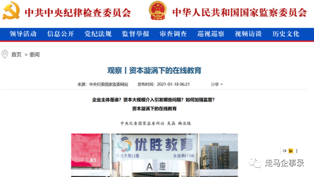 因此,在线教育成为今年整治的重点。1月18日,中央纪委国家监委网站发布文章直指风口浪尖上的在线教育乱象与监管问题。