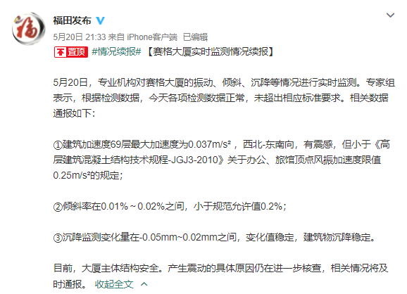 5月20日,@福田发布 再次公布“情况续报”称: 专业机构对赛格大厦的振动、倾斜、沉降等情况进行实时监测。专家组表示,根据检测数据, 今天各项检测数据正常,未超出相应标准要求。