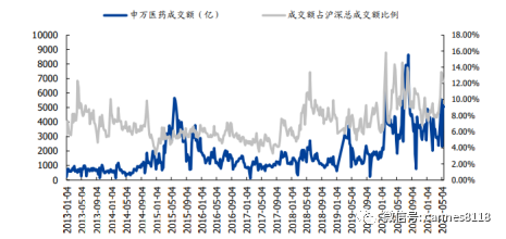 图表 :2013 年以来申万医药行业成交额以及在市场中占比的走势变化