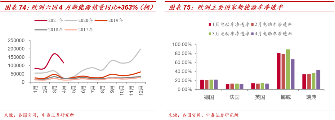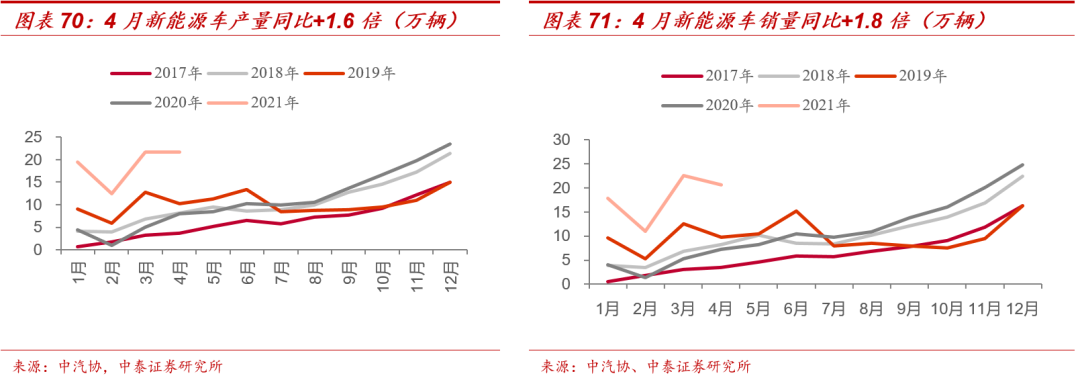 1、 需求景气度持续上行: 1)国内4月新能源汽车产销分别达到21.6万辆和20.6万辆,同比增长1.6倍和1.8倍;2)欧洲六国(英法德挪威瑞典荷兰)4月新能源汽车销量11.55万辆,同比增长353%,由于季节性因素扰动,4月环比下滑约32%;3)3月15日,大众举办首届Power Day,预计2030年在欧洲建立6座超级电池工厂,总产能达到240GW/年;4)3C消费方面,国内手机市场总体出货量2748.6万部,同比下滑34.1%,其中5G手机出货量2142.0万部,占同期手机出货量的77.9%。 新能源汽车产业链排产持续增加。