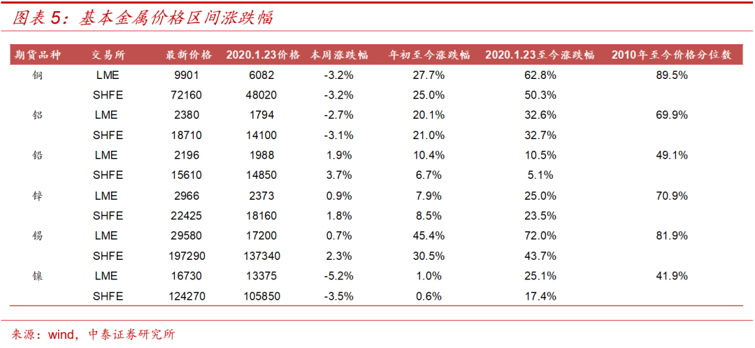 1)基本金属,LME铝、铜本周涨跌幅分别为-2.7%、-3.2%;