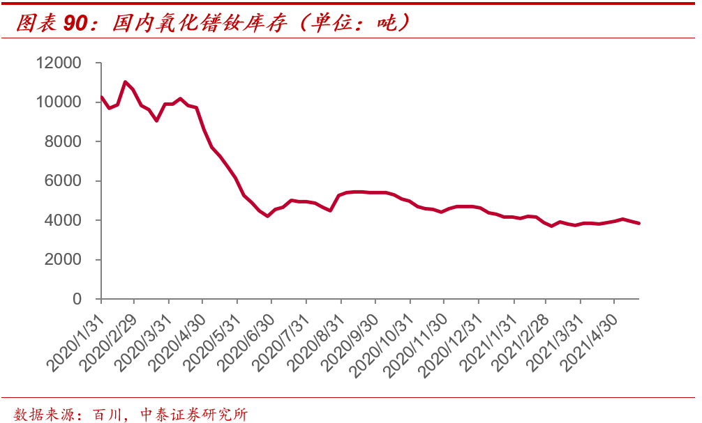 4、 稀土和永磁进入“量价齐升”阶段。 供给端,工信部发布2021年第一批稀土总量控制指标,较2020年增长18000吨REO,折氧化镨钕约3200吨左右,不改行业景气趋势;而需求端,以新能源汽车、变频家电、风电等为主的绿色经济领域持续高增长,带动氧化镨钕供不应求,价格持续上行,本周国内氧化镨钕下降6.8%,钕铁硼N35毛坯报价较上周下跌4.9%,氧化镨钕库存环比下降114吨。钕铁硼磁材作为稀土板块下游“影子”,以“原料库存 & 毛利率定价”模式,直接受益稀土价格上行。