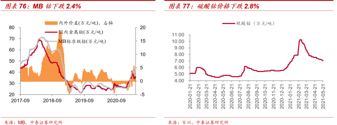 3、 钴价上行方向不改。 本周,MB钴(标准级)、MB钴(合金级)分别环比下跌1.4%、1.4%。1)二季度预计原料紧张局面有所缓解,二季度为3C消费传统淡季,数码3C采购需求订单下滑,动力、小动力采购需求订单基本维持,钴价短期承压;2)拉长周期来看,下游需求端持续向好,在爆款车型带动下,新能源汽车排产持续高景气,随着海外疫苗的接种,海外磁性材料、催化剂、电子等其他行业陆续恢复,海外贸易商采购增加,钴价上行方向不变。