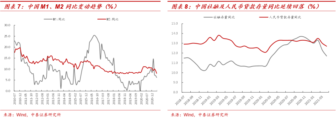 1)中国,流动性数据持续收紧,四月份国内M1、M2同比分别6.2%、8.1%,环比分别回落0.9、1.3pcts,回落速度有所加快;四月份国内社会融资存量同比11.7%,环比回落0.6pcts,国内人民币贷款存量同比12.7%。环比回落0.3pcts,信用数据延续回落趋势;
