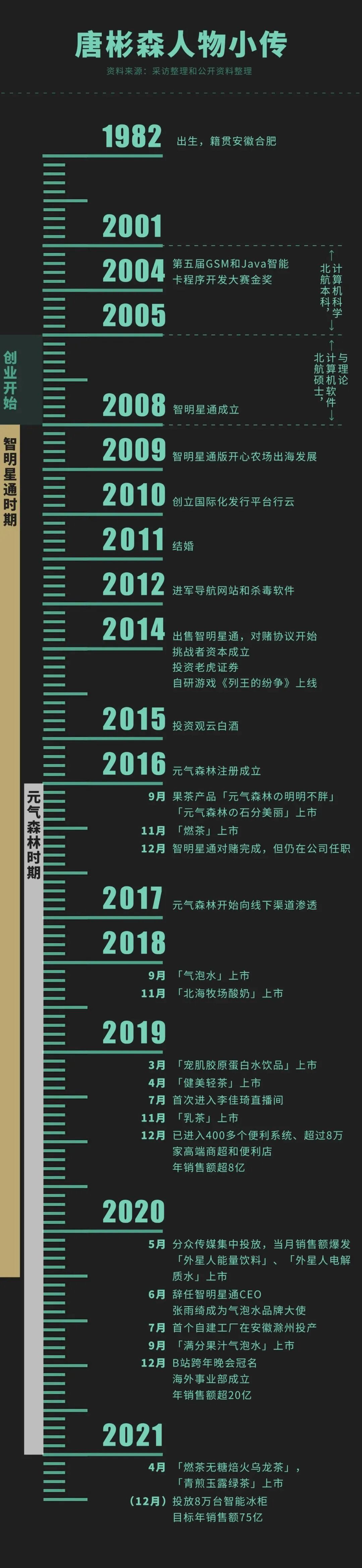 在将自己白手起家建立的游戏公司出售之后,唐彬森经历了短暂的调整探索期,后于2016年创立元气森林。