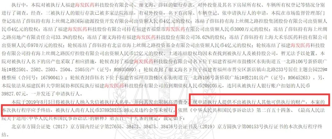 2019年5月,外贸信托将海发医药及福建协和医院告至法院。从终审判决结果看,海发医药已无可供执行的财产,也无法履行支付3.78亿元及违约金。