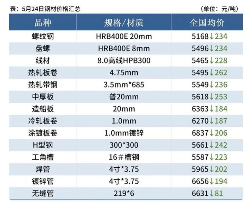 5月24日,国内钢材现货价格继续大跌,生产企业纷纷下调出厂价,唐山普方坯出厂价报4920元/吨,基本回吐了“五一”以来的涨幅;期货方面,螺纹钢主力合约自5月12日以来开启连续大跌,至最高点最大回撤幅度超过20%,调整可谓相当剧烈。