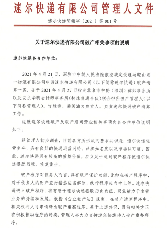 公告显示,2021年4月,深圳市中级人民法院依法裁定受理马鞍山则一物流有限公司申请速尔快递破产清算一案,指定北京市中伦(深圳)律师事务所以及安永华明会计师事务所(特殊普通合伙)联合担任破产管理人,负责速尔快递破产清算工作。