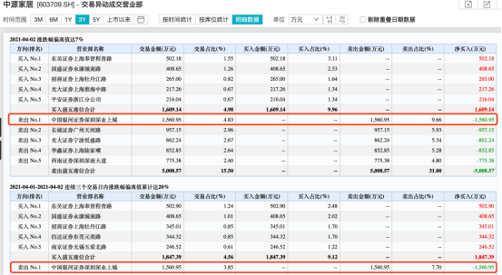 以银河证券深圳深业上城证券营业部为例,Wind数据显示,这家营业部之前从未出现在中源家居、利通电子的交易异动席位名单中,却双双在4月初股价闪崩时上榜第一大卖出席位。