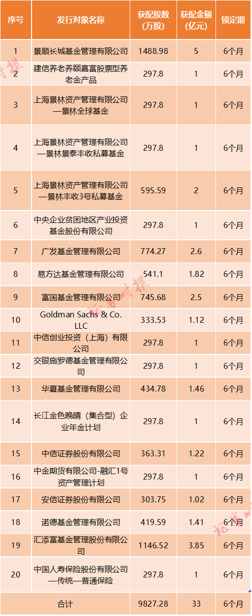 5月14日晚间,涪陵榨菜披露非公开发行A股股票发行情况报告书暨上市公告书显示,本次定增募资金额为33亿元。此次发行对象最终确认为20家,包括景顺长城、广发基金、易方达基金等公募基金,上海景林资产等私募,以及高盛一家外资机构。