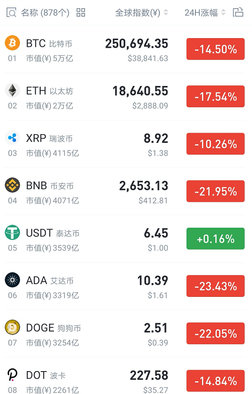 今日,比特币跌破39000美元关口,24小时跌幅超过14%,较今年4月创下的历史高点回落40%。此外,以太坊跌破2900美元关口,跌幅超17%;币安币、狗狗币暴跌约22%。