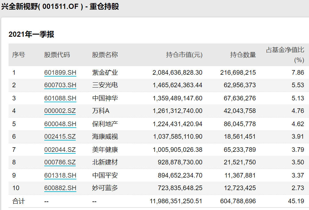 据2021年一季度显示,截至3月31日,兴全新视野前十大重仓股分别是紫金矿业、三安光电、中国神华、万科A、保利地产、海康威视、美年健康、北新建材、中国平安和妙可蓝多。