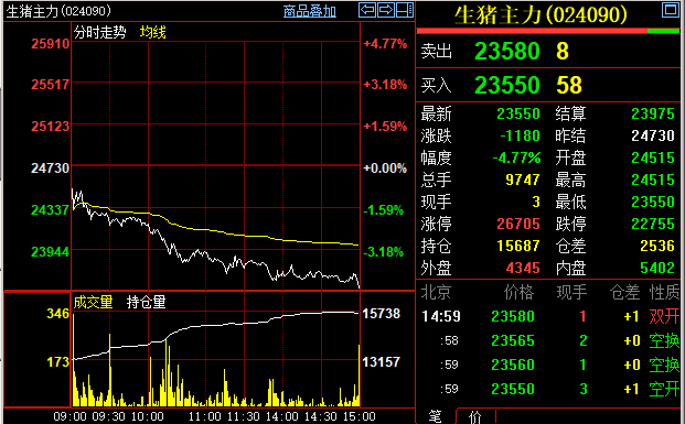 5月19日,生猪期货主力合约收盘报价23550元/吨,跌幅达到4.77%。这也是生猪期货1月8日上市首日盘中达到30680元/吨高点以来,累计下跌达到7130元/吨之后,创下上市以来最低价格。