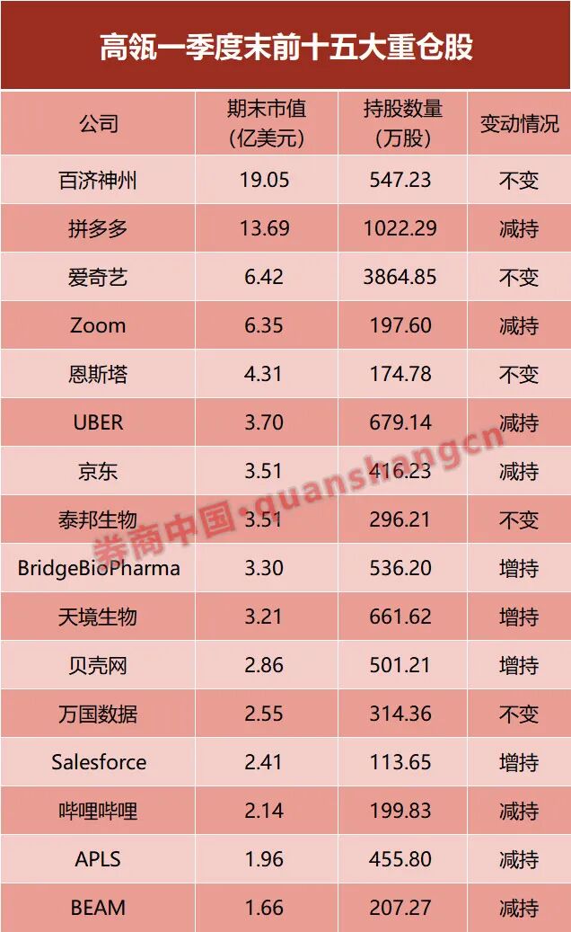 其中,由于拼多多股价在一季度大幅调整,持仓市值从四季度末的18亿美元跌至13.67亿美元;百济神州则强势上涨,市值飙升至19.05亿元,新晋为高瓴第一大重仓股。