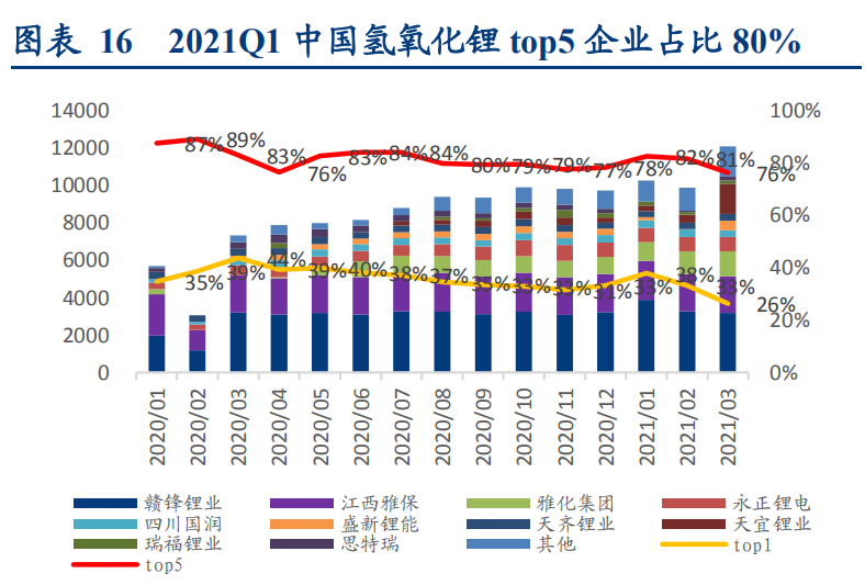 雅宝仍占据市场 25%左右的份额,位居第二位;天宜锂业异军突起,3 月份氢氧化锂产量已经高居国内第三位;雅化则位居第四位。