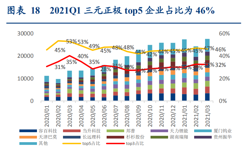 我们也对比最近三年的数据,三元正极行业集中度一直比较低,龙头占比一直无大幅度提高市场占有率。