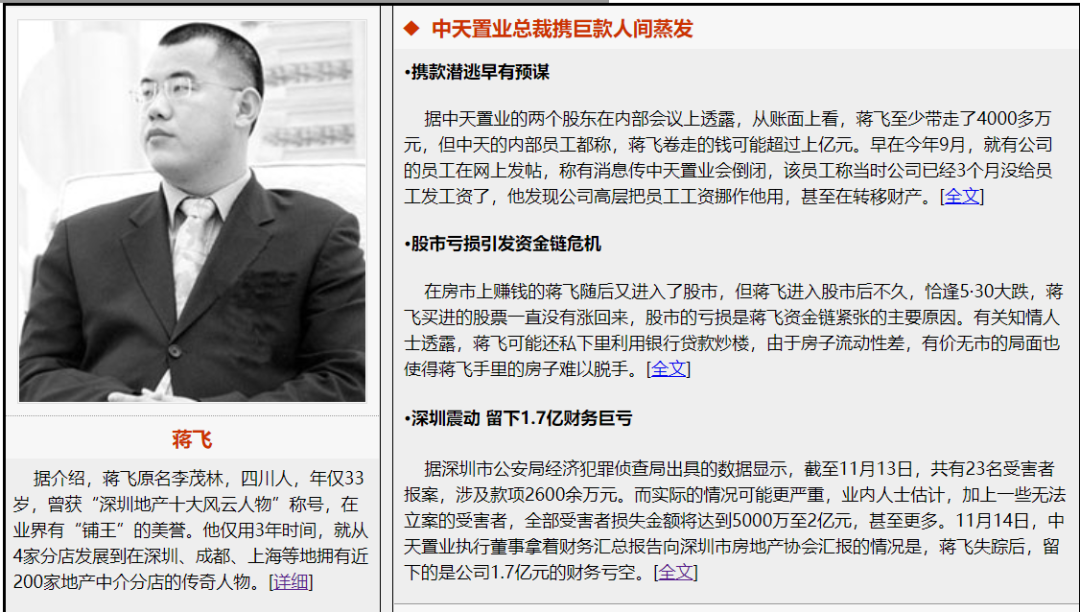 蒋飞最后倒在了“金融创新”上,2008年金融危机导致珠三角房地产市场突然低迷,蒋飞资金链断裂,拥有深圳、上海136家门店的中天置业,最后资金链断裂一夜崩盘,疑似卷款1.7亿潜逃。