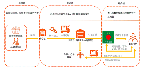 核心前置仓反成负担 叮咚买菜实现快速扩张得益于其发扬了由每日优先首创的前置仓玩法,由城市配送中心进行供货,在小区、社区1-3公里内完成储存、分拣、配送,通过加大前置仓建设密度从而达到29分钟左右送至用户手中的效能。 并且通过精确的数字化技术以销定采,免去了需要自行运营货源的压力之外减少了对冷链技术的依赖程度,从而达到降低成本的目的。同时还能防止对货源监管缺失带来的风险,用卖前多次品控及售后回访等形式监管把控。