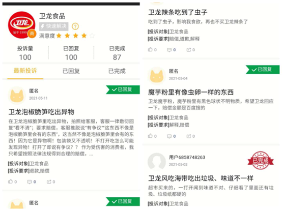 据悉,2019年1月至2020年5月,在黑猫投诉上卫龙共接到100起投诉,内容包括吃出异物或食品变质等等。另外,据wind法律诉讼统计,2020年其还有被执行人信息。有意思的是,一则关于平平食品在中国执行信息公开网的信息现已消失。
