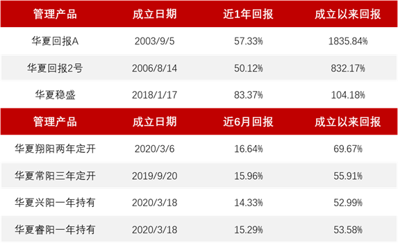 基金业绩数据来源:基金定期报告,华夏基金,业绩已经托管行复核;蔡向阳在管产品任职日期:华夏回报A任职于2014/05/28,数据截止2021/4/2;华夏回报2号任职于2014/05/28,华夏稳盛、华夏翔阳、华夏兴阳、华夏睿阳于基金成立时开始任职,业绩截至2021/3/31,在管其他基金过往业绩不预示基金未来表现。