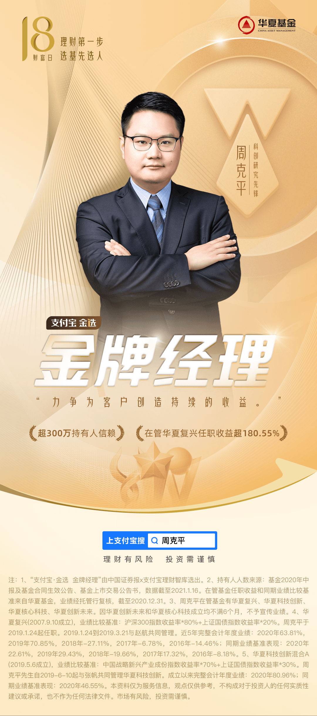 注:1、“支付宝·金选 金牌经理”由中国证券报x支付宝理财智库选出。2、持有人人数来源:基金2020年中报及基金合同生效公告、基金上市交易公告书,数据截至2021.1.16。在管基金任职收益和同期业绩比较基准来自华夏基金,业绩经托管行复核,截至2020.12.31。3、周克平在管基金有华夏复兴、华夏科技创新、华夏核心科技、华夏创新未来。因华夏创新未来和华夏核心科技成立均不满6个月,不予宣传业绩。4、华夏复兴(2007.9.10成立),业绩比较基准:沪深300指数收益率80%+上证国债指数收益率20%。周克平于2019.1.24起任职。2019.1.24到2019.3.21与赵航共同管理。近5年完整会计年度业绩:2020年63.81%,2019年70.85%,2018年-27.11%,2017年-6.78%,2016年-14.46%;同期业绩基准表现:2020年22.61%,2019年29.43%,2018年-19.66%,2017年17.32%,2016年-8.18%。5、华夏科技创新混合A(2019.5.6成立),业绩比较基准:中国战略新兴产业成份指数收益率70%+上证国债指数收益率30%。周克平先生自2019-6-10起与张帆共同管理华夏科技创新。成立以来完整会计年度业绩:2020年80.96%;同期业绩基准表现:2020年46.55%。