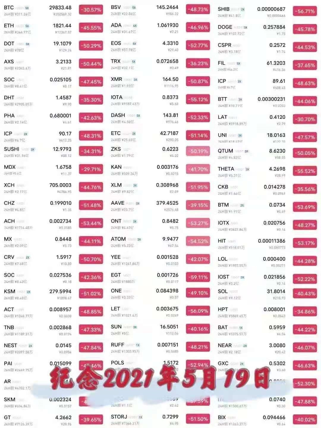 5月19日,加密货币迎来了本轮牛市最大的一次冲击。24小时内,比特币下跌30%,险些刺穿3万美元,较此前6.4万美元的最高价已经腰斩;以太坊跌幅更是达到46%,下探至1900美元。