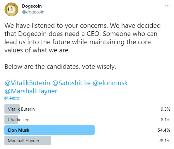 2019年的4月2日,狗狗币官方发布了“谁适合成为下任狗狗币CEO?”的调查。马斯克以绝对票数优势,力压包括以太坊创始人V神在内的一众群雄。
