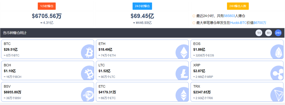 最新数据显示,截止早上8时7分,最近24小时内,共有约58.58万人成为爆仓受害者,最大单笔爆仓发生在Huobi-BTC,价值高达6700万美元。而在此前的5月17日和19日,比特币已经经历过两次大规模爆仓。