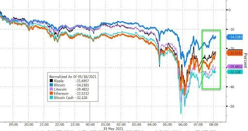 不过两位灵魂人物都出来喊话:木头姐高呼比特币仍将涨至50万美元,而马斯克则称特斯拉有钻石手,这意味着特斯拉将持有仓位直到目标。此后加密货币反弹,跌幅收窄至此前一半,比特币重返4万美元。