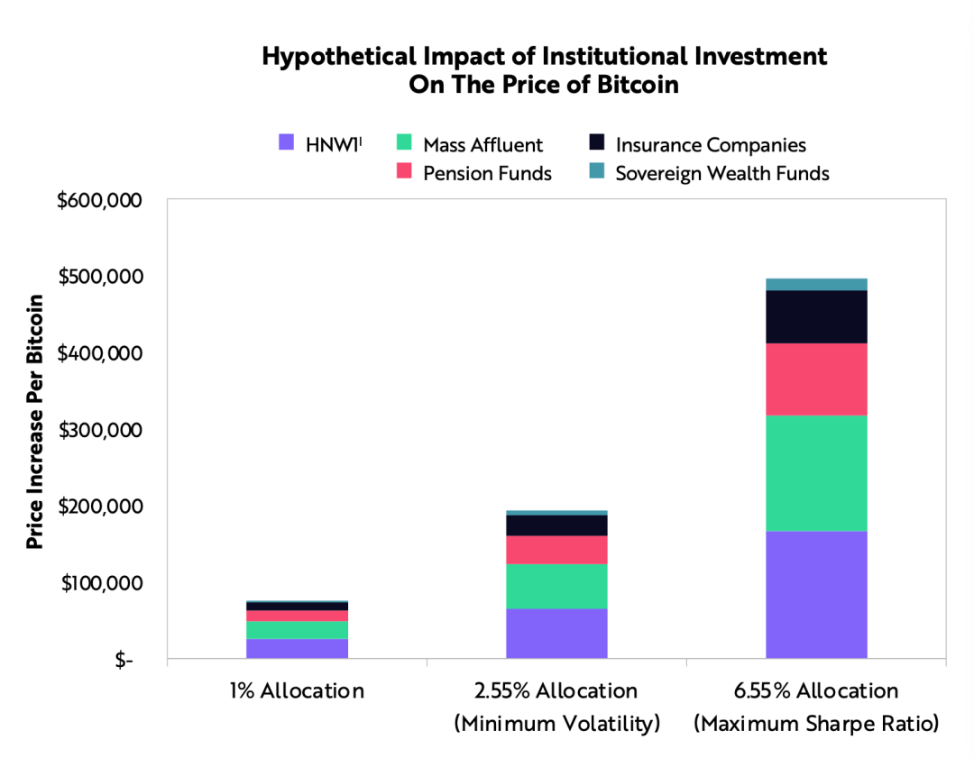 在2021年Big Ideas年度报告中,“木头姐”的ARK公司就提到,如果标普500成分股公司都拿出资产负债表里1%的现金来配置比特币,比特币单价将上涨4万美元;若配置比例变为10%,则单价将相应上涨40万美元。此外ARK还表示,如果机构投资者配置比特币的比例达到6.55%,比特币的单价将因此上涨50万美元。
